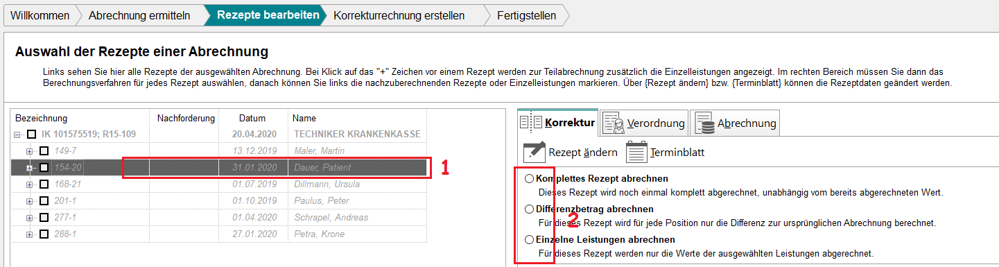 Sobald Sie für die Korrekturrechnung eine Rechnungsnummer eingegeben haben und in der „Auswahl der Rezepte einer Abrechnung“ stehen, müssen Sie zunächst auf der linken Seite das Rezept, mit dem Sie etwas machen möchten, markieren (1) – NICHT anhaken, sondern die Zeile markieren. Anschließend können Sie rechts festlegen, WAS genau Sie mit diesem Rezept machen möchten (2).