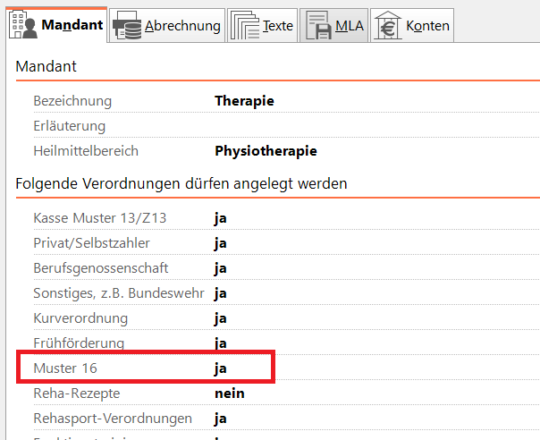 Sollten Sie bei der Rezeptneuanlage diesen Rezepttyp nicht zur Auswahl haben, so ist er in den Mandanteneinstellungen nicht freigegeben. Prüfen Sie in {Stammdaten} {Mandanten} die Einstellung bei „Muster 16“. Hier muss ein „ja“ stehen. Bei „nein“ gehen Sie über „Ändern“ und setzen den entsprechenden Haken.
