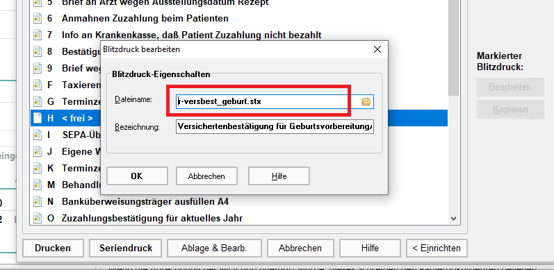 Gehen Sie in der Rezeptekartei auf „Drucken“, dann unten rechts auf „Einrichten“. Markieren Sie eine „freie“ Zeile und wählen Sie anschließend oben rechts „Ändern“. Hier hinterlegen Sie den Text r-versbest_geburt.stx und schließen das Fenster mit OK.