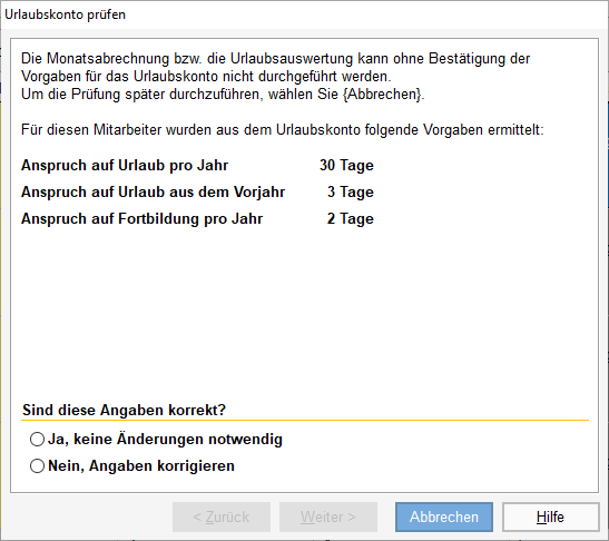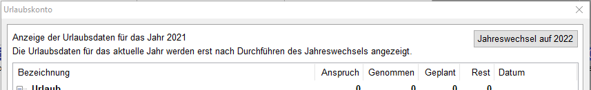 Nach dem Jahreswechsel ist es bis zur ersten Monatsabrechnung im neuen Jahr noch möglich, die Urlaubsdaten im {Urlaubskonto} zu bearbeiten bzw. zu korrigieren.