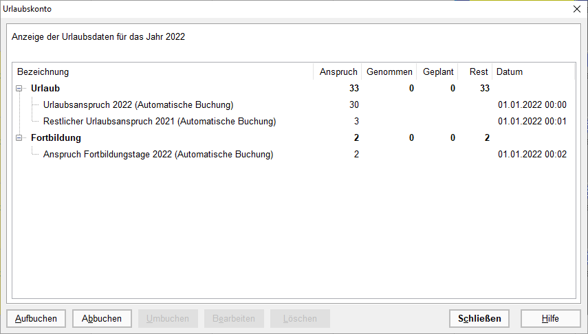 - Der Resturlaub wird automatisch berechnet und im Urlaubskonto als „Restlicher Urlaubsanspruch Vorjahr (Automatische Buchung)“ angelegt.