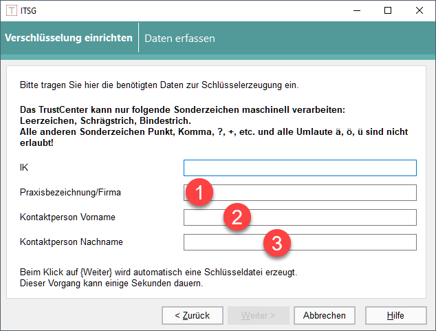 - Im Feld „Praxisbezeichnung/Firma“ muss der Name des IK-Inhabers mit genannt werden, also zum Beispiel „Praxis für Physiotherapie Hans Müller“.
