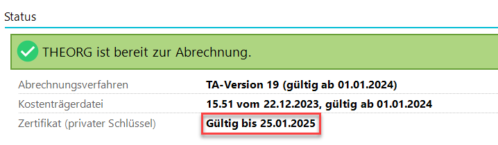 Wenn Sie zur Sicherheit die Gültigkeit Ihres Zertifikats in THEORG prüfen möchten, können Sie dies in {Aktionen} {Abrechnung} tun. Hier sehen Sie auf der linken Seite in der Zeile „Zertifikat (privater Schlüssel)“ ganz genau, wie lange Ihr aktuelles Zertifikat noch gültig ist.