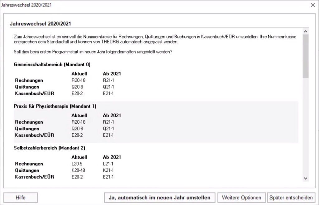 Sofern Ihre Nummernkreise aus der aktuellen Jahreszahl und einer Nummer bestehen, kann THEORG Ihre Nummernkreise automatisch umstellen. Aus beispielsweise „R20-98“ wird also automatisch „R21-1“. Mit einem Klick auf den Button {Ja, automatisch im neuen Jahr umstellen}, ist die Vorbereitung erledigt. Sie können auch später über die Umstellung entscheiden – das Fenster erscheint dann erneut beim nächsten Programmstart.