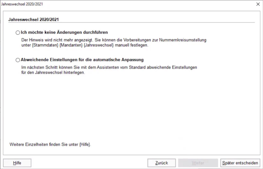 Da eine Umstellung der Nummernkreise nicht zwingend erforderlich ist, ist die Durchführung der Änderungen nicht verpflichtend. Sollten Sie sich erst später dafür entscheiden, kann der Jahreswechsel-Assistent natürlich auch zu einem späteren Zeitpunkt manuell aufgerufen werden. Rufen Sie dazu im Menü {Stammdaten} {Mandanten} den Punkt {Jahreswechsel} auf.
