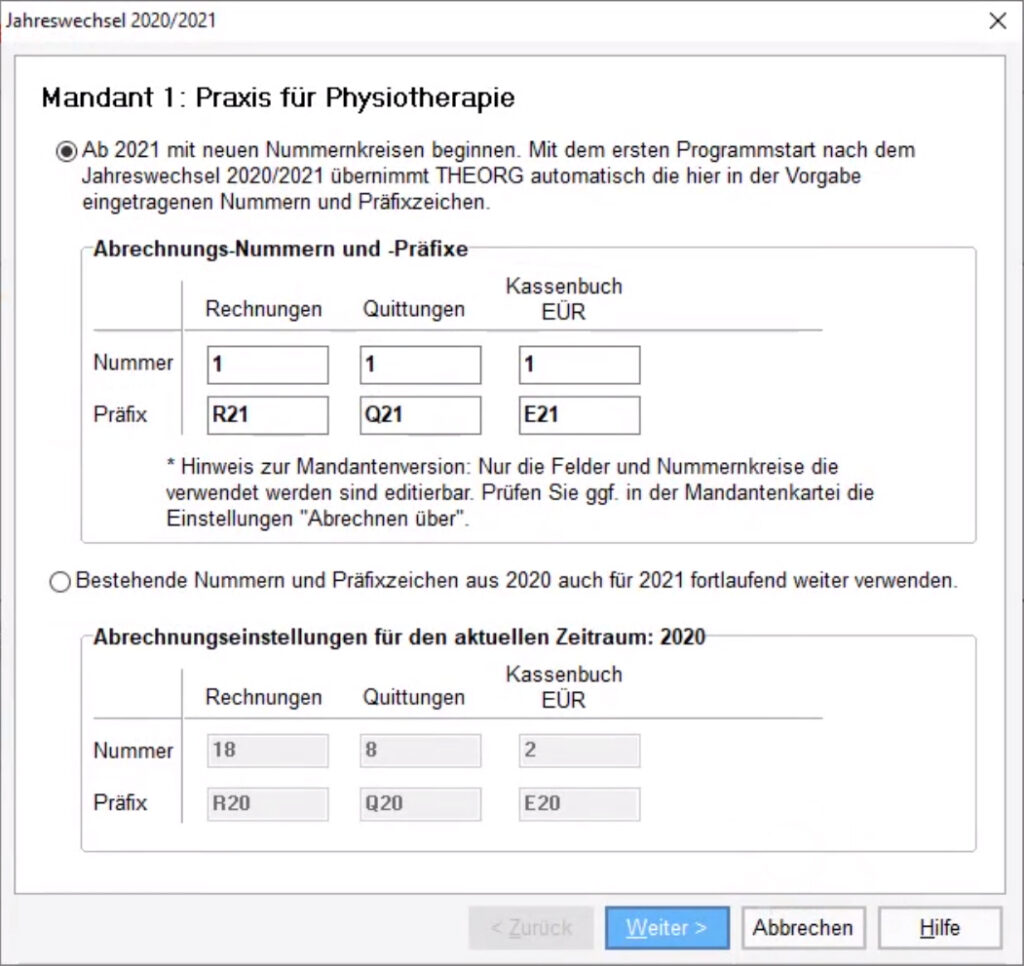 Alternativ können Sie sich nach einem Klick auf {Weitere Optionen} dazu entscheiden, keine Änderung vorzunehmen oder abweichende Einstellungen für die Umstellung festzulegen. In letzterem Fall erscheint der Jahreswechsel-Assistent, der auch erscheinen würde, wenn THEORG Ihre Nummernkreise nicht automatisch umstellen kann. THEORG schlägt vor, die neue Jahreszahl – in diesem Fall die 21 – im Präfix zu verwenden. Die Nummern werden demzufolge auf 1 zurückgesetzt. Daraus ergibt sich ein neuer Nummernkreis, der ab dem neuen Jahr beginnt. Alternativ können Sie die Nummern weiterhin fortlaufend mit dem alten Präfix verwenden. Eine Umstellung wird für Rechnungs- und Quittungsnummern sowie Belegnummern der Einnahme-Überschuss-Rechnung des Kassenbuchs empfohlen. Weitere Hinweise erhalten Sie über den Button {Hilfe}.
