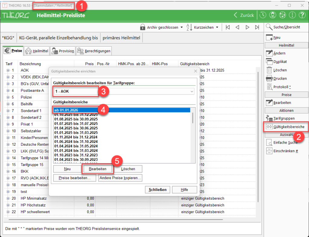 Prüfen Sie Ihre Hausbesuchsleistungen in THEORG in {Stammdaten} {Heilmittel} Lasche {Preise} und achten Sie darauf, dass bei allen Tarifen der gesetzlichen Kassen im Gültigkeitsbereich ab 01.01.2026 die neue Positionsnummer neben dem Heilmittelpreis steht. Mit einem Doppelklick auf die Zeile könnten Sie die Änderung vornehmen, falls Sie sie bisher übersehen haben.