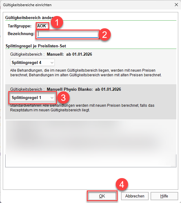 3. Passen Sie für den „Gültigkeitsbereich: Manuell Physio Blanko: ab 01.01.2026“ die Splittingregel an. Sie muss auf [Splittingregel 4] eingestellt werden.
